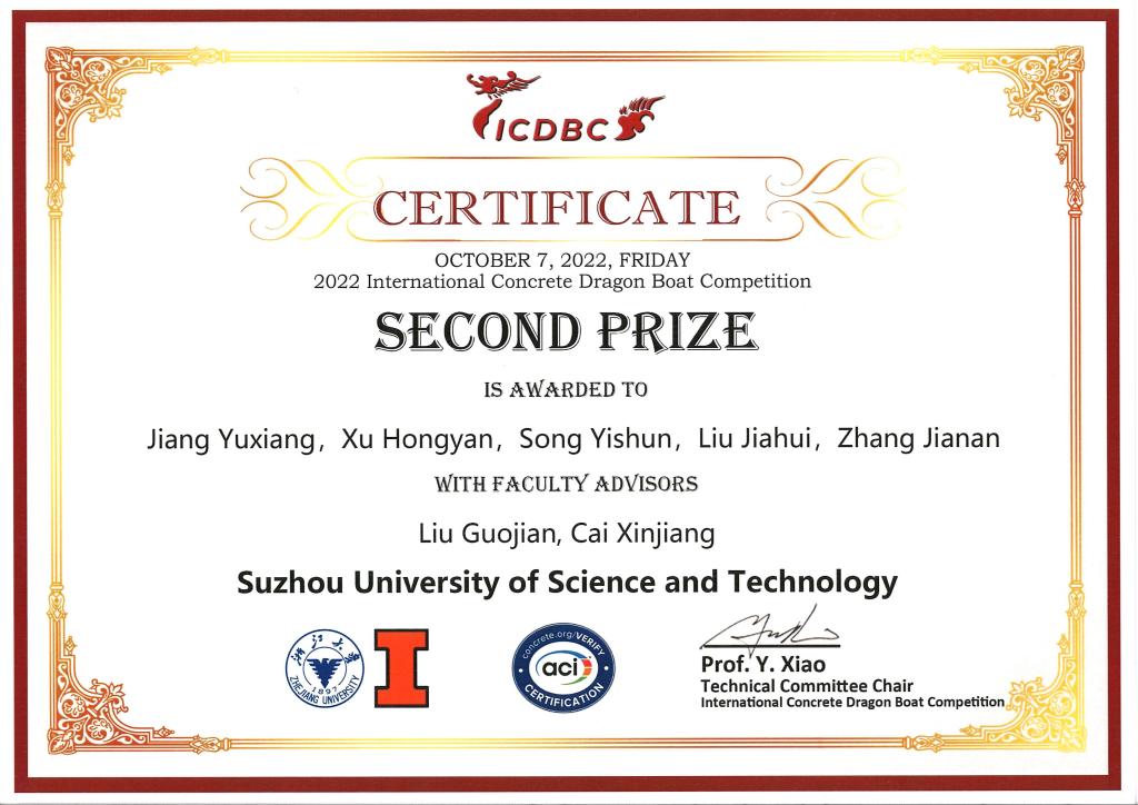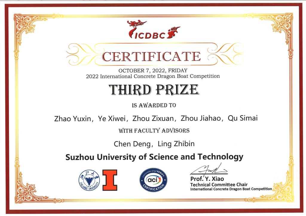 作者:刘国建 图片作者:刘国建 发布日期:2022-10-13 浏览:次10月7日,第四届国际大学生混凝土龙舟邀请赛(ICDBC 2022)于线上举行。经过激烈角逐,由搜同 刘国建、蔡新江老师指导,姜宇翔、徐鸿雁、宋易顺、刘嘉慧、张嘉南等5名学生设计制作的“鏊雪号”龙舟荣获二等奖;由搜同 陈登、凌志彬老师指导,赵雨欣、叶锡威、周子璇、周佳浩、瞿思劢等5名学生设计制作的“纵海号”龙舟荣获三等奖、技术创新奖。