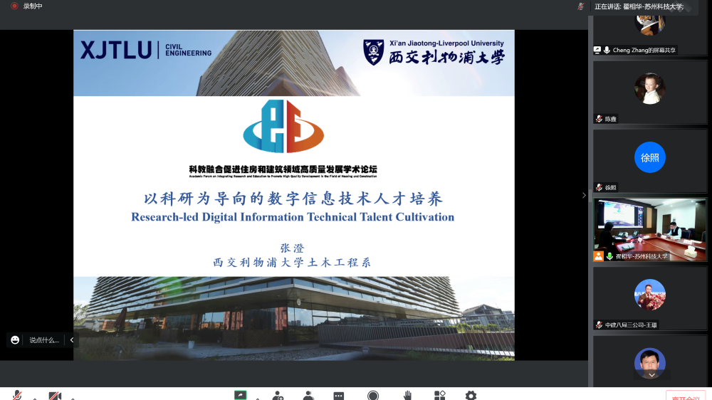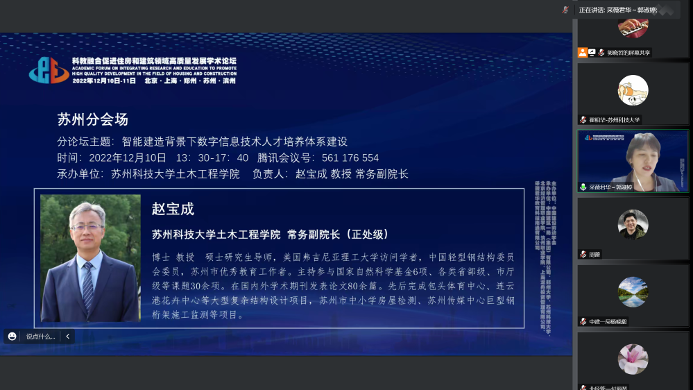 本次会议苏州分会场论坛专题为“智能建造背景下数字信息技术人才培养体系建设”。苏州分会场由我校搜同 承办,常务副院长赵宝成负责,副院长陈鑫和工程管理系教授祝连波主持。苏州分会场报告来自10所高等院校和知名企业单位,包括东南大学、西交利物浦大学、兰州理工大学、天津城建大学、西南石油大学、济南工程职业技术搜同、江苏联合职业技术搜同、中建八局第三建设有限公司、中建七局第二建筑有限公司、中亿丰建设集团股份有限公司。