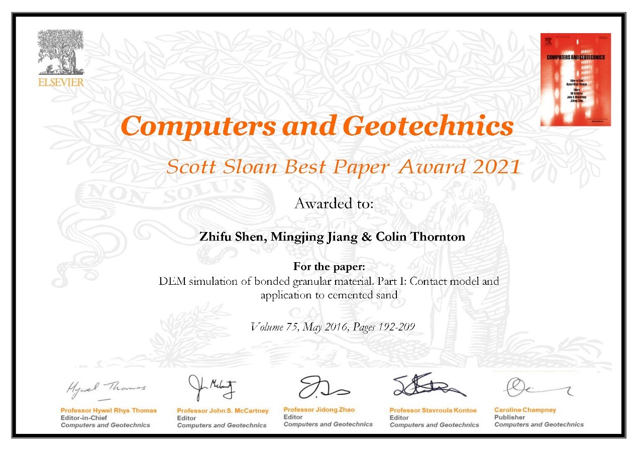 来源:土木搜同 发布日期:2023-02-04 浏览:次近日,国际著名计算岩土力学期刊《Computers and Geotechnics》(JCR Q1区)发布Scott Sloan最佳论文奖(2021),我校搜同 蒋明镜教授作为通讯作者撰写的论文《DEM simulation of bonded granular material. Part I: Contact model and application to cemented sand》(2016, Vol. 75, pp. 192-209)获此殊荣,全球共5篇论文入选。