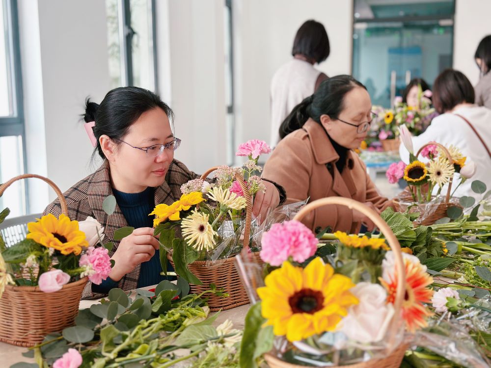 在特邀花艺师的精心指导下,向日葵、洋甘菊、玫瑰、非洲菊、康乃馨等各色鲜花,经过女老师们精心巧妙的构思、修剪、整枝和装饰,变成了一件件精美的艺术品,充满诗情画意,让大家在细碎的时光研磨中也能品味生活的明媚与浪漫。