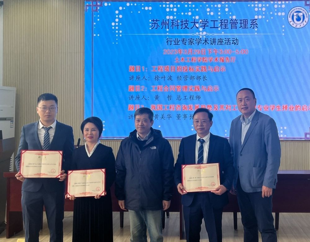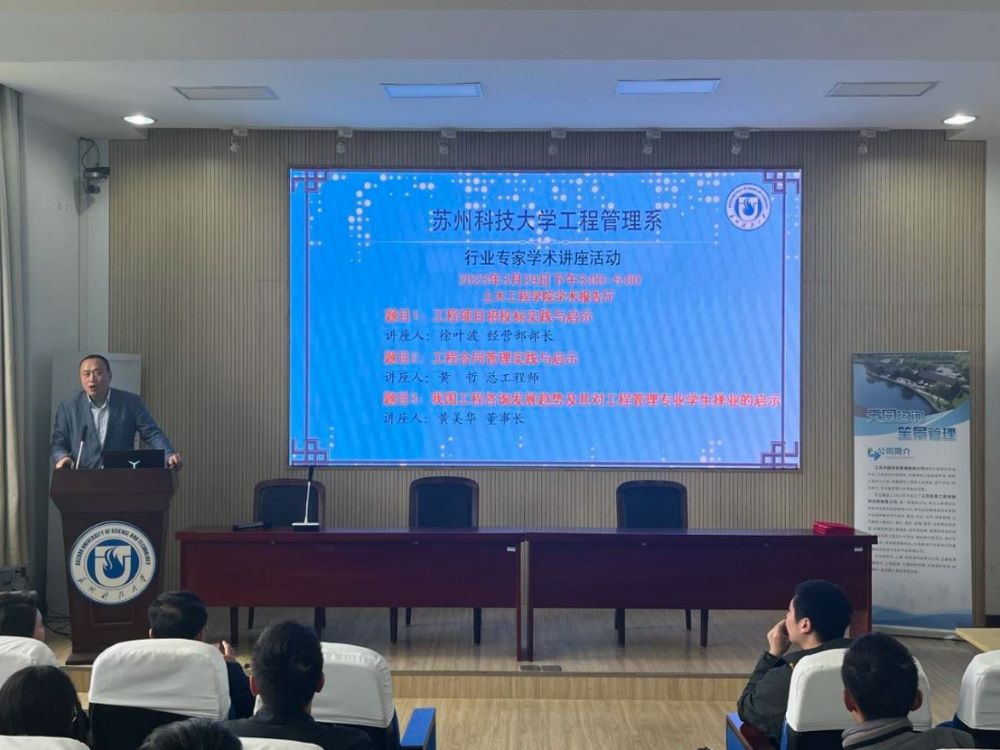 作者:张奇 图片作者:张阔豪 发布日期:2023-03-30 浏览:次为培养学生的社会适应性,增强对本专业现状和发展前景的认知,提高就业能力,2023年3月29日下午,搜同 工程管理系举办行业专家学术讲座活动。搜同 副院长范存新出席,江苏笙景工程管理研究院有限公司董事长黄美华、总工程师黄哲、经营部部长徐叶波担任主讲人。讲座由工程管理系主任张尚主持,工程管理系部分教师以及工程管理专业20级全体学生、21级学生代表参加。