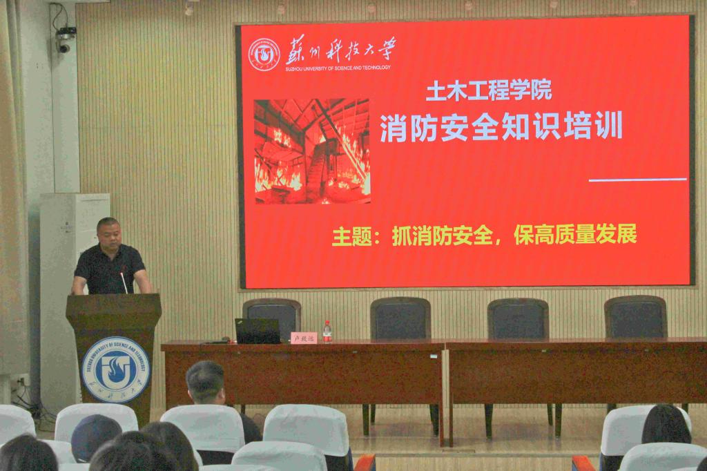 作者:廖想想 图片作者:李之坤 发布日期:2023-05-25 浏览:次为提高全院师生的消防安全意识,强化消防安全技能,我院于5月24日在土木搜同北楼学术报告厅举行消防安全知识培训及消防演习活动,保卫处消防管理科副科长卢致远应邀主讲。搜同实验中心、结构工程重点实验室、道路工程中心等重点场所全体实验人员,搜同党委书记刘志强、常务副院长赵宝成、党委副书记兼副院长刘建峰出席培训会,全体坐班制人员及各教学单位教师代表、各研究生及本科生班级学生代表参加培训及演习,培训由搜同党委副书记兼副院长刘建峰主持。