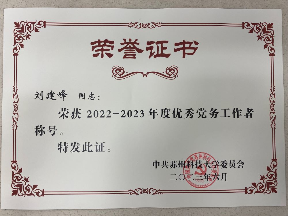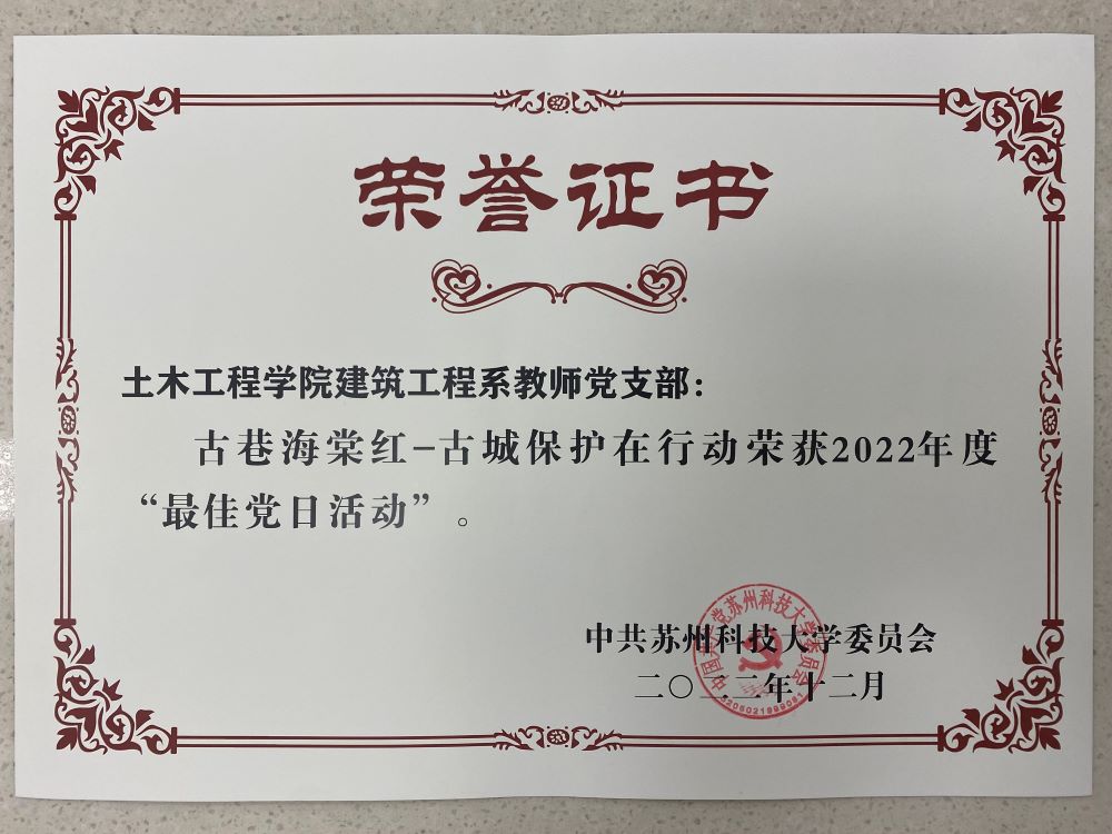 搜同党委获评2022-2023年度“校先进基层党组织”(全校表彰10个);我院党委“‘党建+’赋能人才培养,产教融合助推高质量就业”获评2022年校党建工作创新奖(全校表彰4个);建筑工程系教师党支部“古巷海棠红-古城保护在行动”主题党日活动获评2022年校最佳党日活动(全校表彰15个);搜同党委副书记兼副院长刘建峰获评2022-2023年度“校优秀党务工作者”(全校表彰5名);建筑工程系教师党支部书记韦俊获评2022-2023年度“校优秀共产党员”(全校表彰15名)。