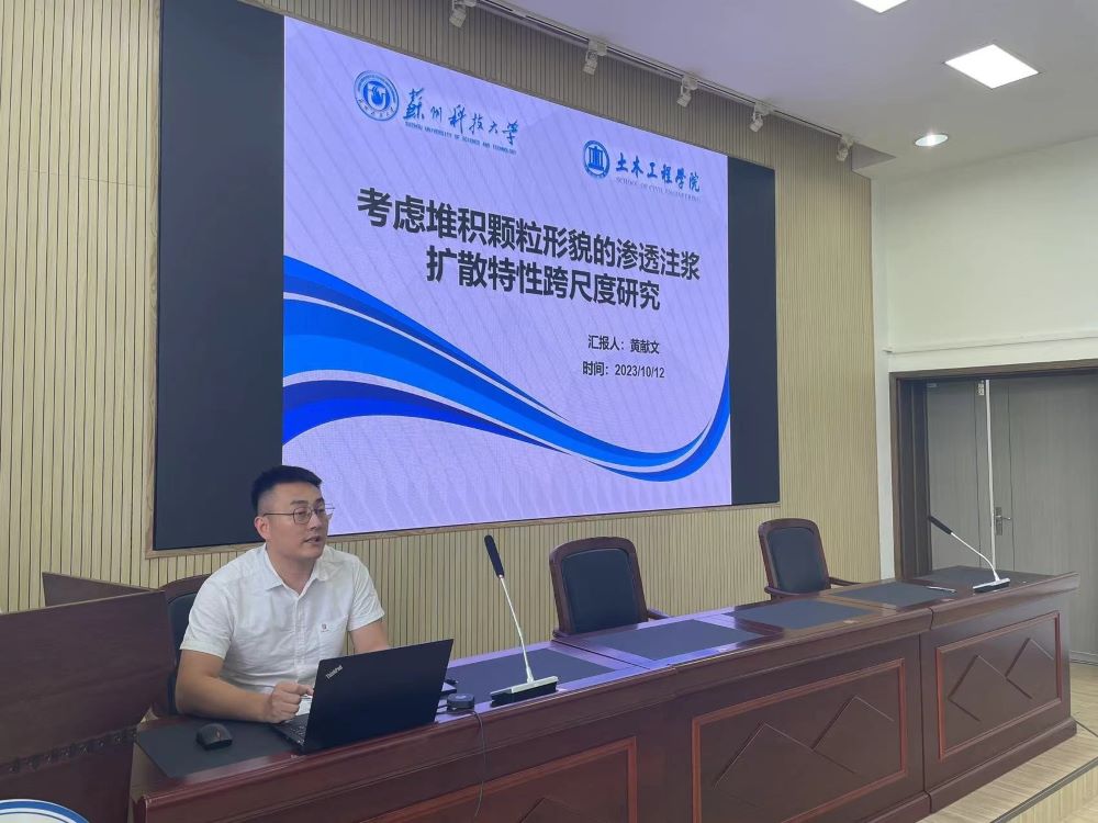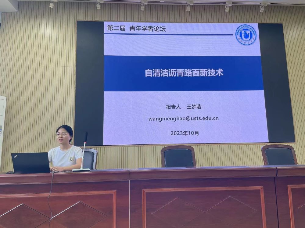 随后,道路桥梁与岩土工程系的两位青年教师向与会师生们分享最新的研究进展与科研心得体会。岩土工程教研室青年教师黄献文作了题为《考虑堆积颗粒形貌的渗透注浆扩散特性跨尺度研究》的学术报告,他以注浆技术在隧道工程中的应用为切入点,从微尺度的颗粒识别特征、中尺度的几何模型建立和大尺度的模型预测三个方面跨尺度地分析了渗透注浆半径的预测方法及注浆效果。道路与桥梁工程教研室青年教师王梦浩作了题为《自清洁沥青路面新技术》的学术报告,她结合国家“双碳”和“交通强国”的战略,汇报了沥青高温抑烟减排技术的研究进展以及全寿命周期自清洁沥青材料改性剂的研发成果。学术汇报结束后,与会人员结合上述汇报内容,与两位老师就感兴趣的议题开展了交流和讨论。