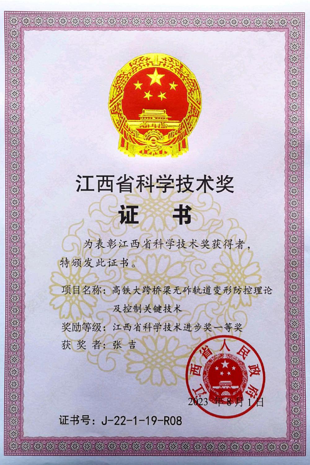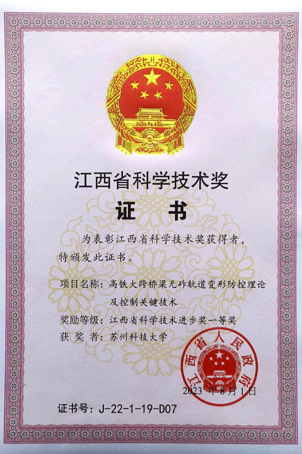 作者:申燕 来源:搜同 发布日期:2023-10-26 浏览:次近日,江西省人民政府颁发了2022年度江西省科学技术奖。由昌九城际铁路股份有限公司牵头,我校搜同 张吉博士参与联合申报的《高铁大跨桥梁无砟轨道变形防控理论及控制关键技术》荣获科技进步一等奖。