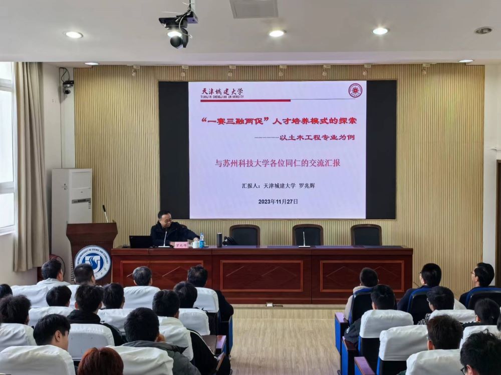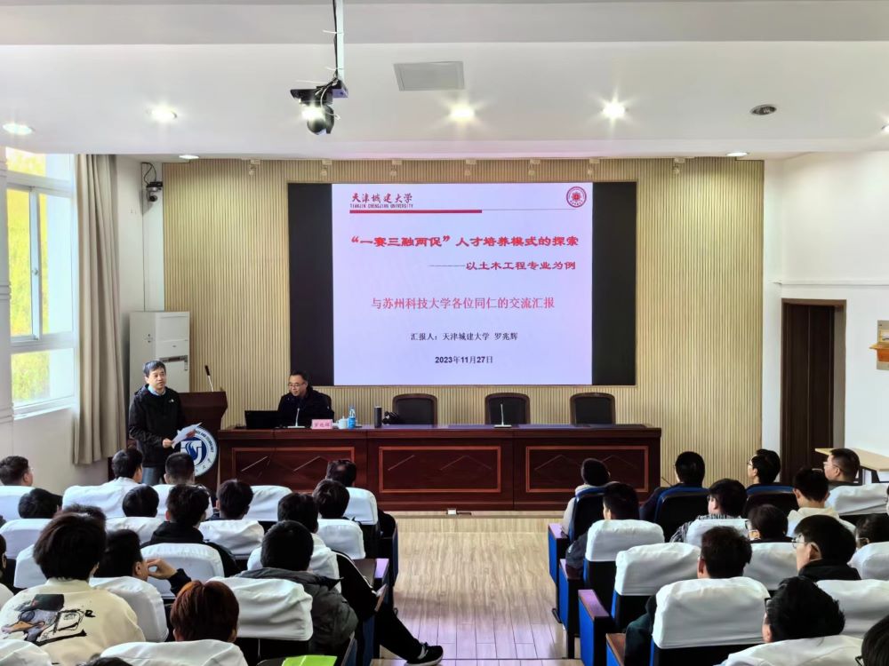 作者:杨俊 图片作者:宫淑阳 发布日期:2023-11-27 浏览:次2023年11月27日下午,应搜同 的邀请,天津城建大学搜同 罗兆辉教授莅临我院指导工作并作学术报告。针对土木工程专业课程的教学、科研及学科竞赛,罗兆辉教授作了题为《“一赛三融两促”人才培养模式的探索-以土木工程专业为例》的报告。搜同相关专业教师、钱七虎卓越班学生等参加了本次报告,报告会由副院长范存新主持。