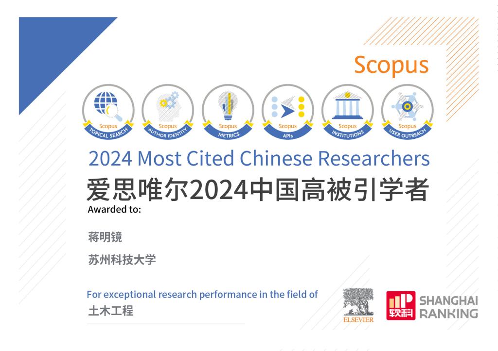 来源:搜同 发布日期:2025-03-26 浏览:次2025年3月25日,全球性信息分析公司爱思唯尔(Elsevier)重磅发布2024“中国高被引学者”(Highly Cited Chinese Researchers)榜单。我院蒋明镜教授在土木工程学科上榜,此次是蒋明镜教授连续六年(2019-2024)入选该榜单。