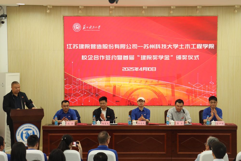 作者:刘建峰、许智琪 图片作者:李之坤 来源:搜同 发布日期:2025-04-11 浏览:次4月10日下午,搜同 与江苏建院营造股份有限公司校企合作签约暨首届“建院奖学金”颁奖仪式在搜同 土木搜同报告厅隆重举行。江苏建院营造股份有限公司董事长徐忠民、总经理管中建、总工程师高强、联席总裁兼勘察设计研究院院长周国伟、党支部书记兼运营总监刘蔚蔚,校发展规划处、审计处处长、教育发展基金会秘书长曹岩,土木搜同院长陈育民,常务副院长赵宝成,院长助理翟相华,以及公司员工代表、校友代表、师生代表和获奖学生参会。会议由土木搜同党委副书记兼副院长刘建峰主持。