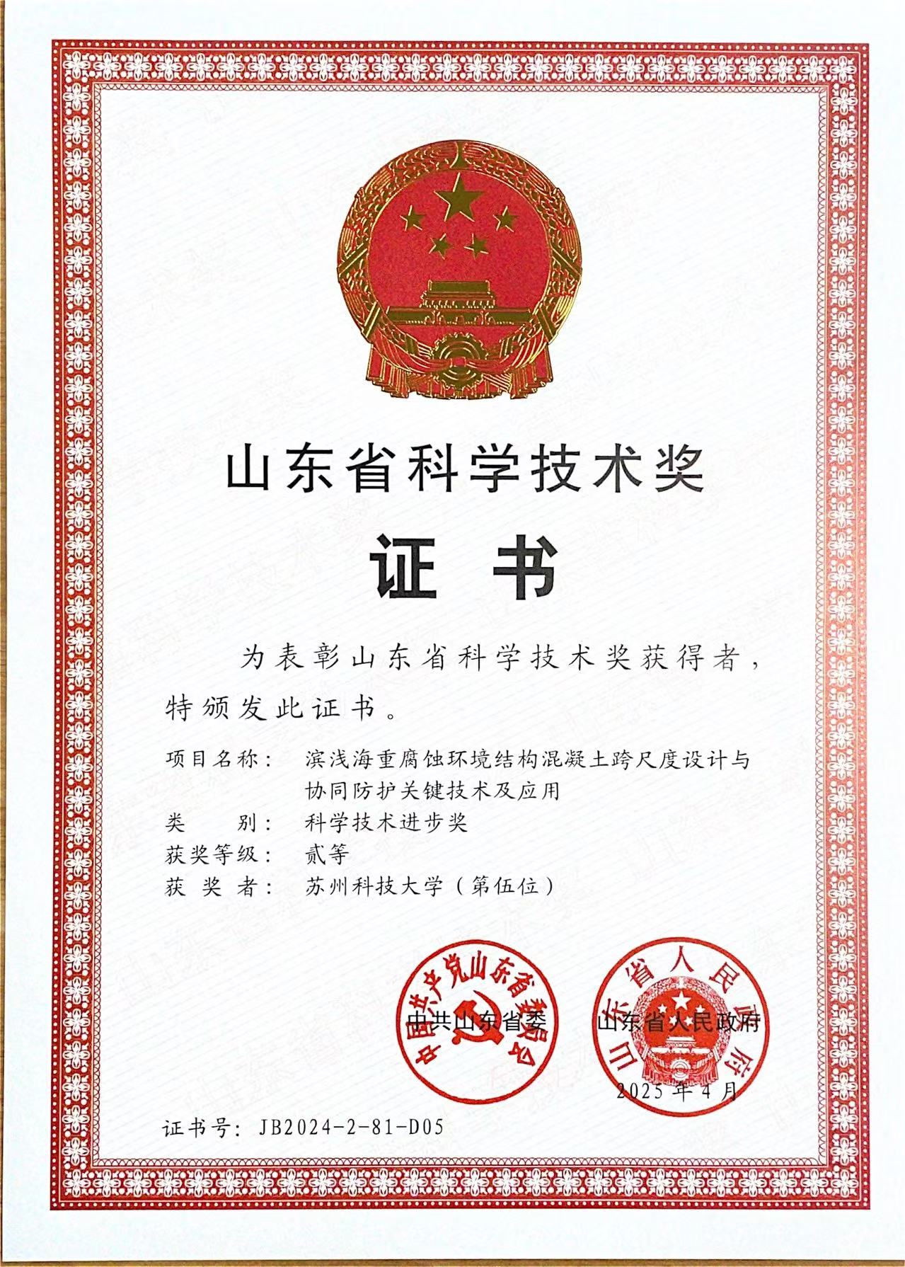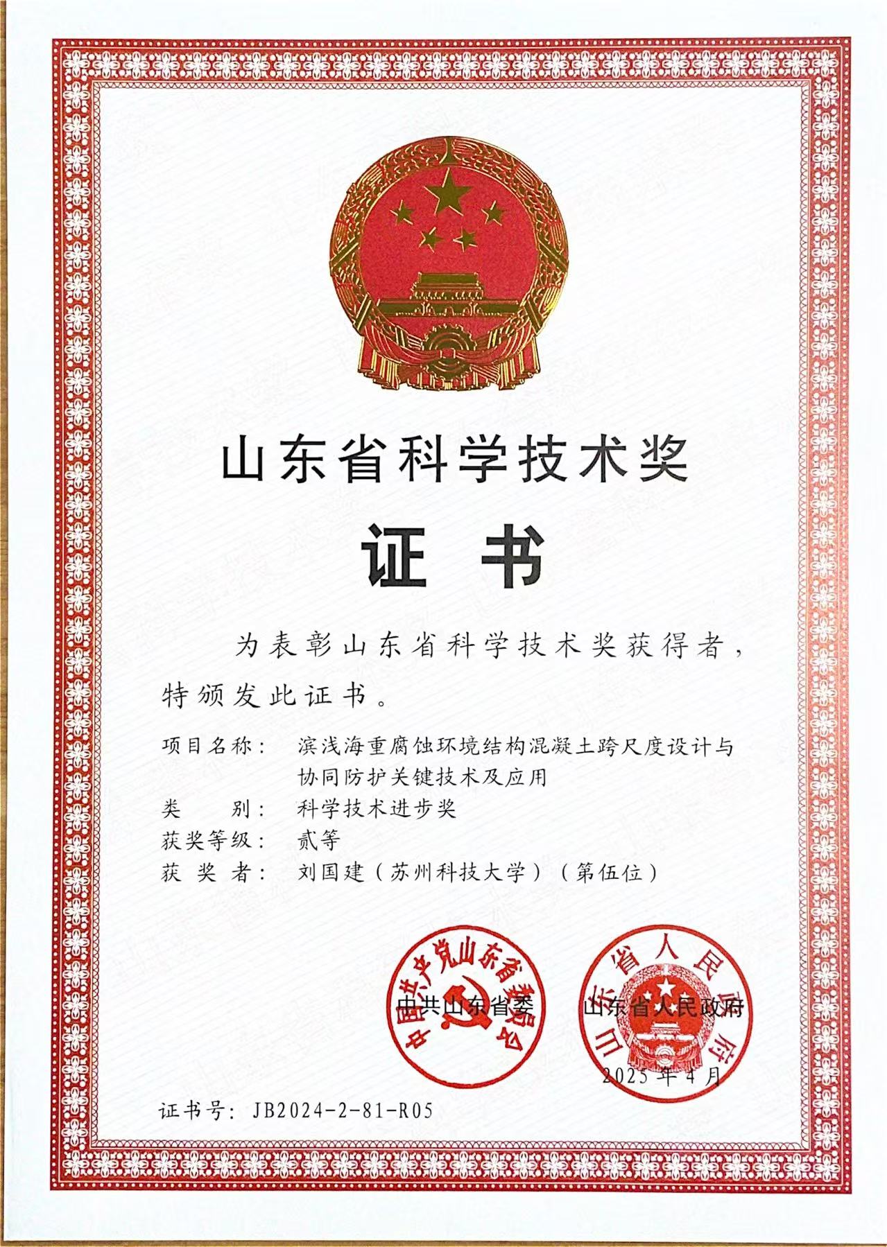 作者:蒋诚钢、申燕 图片作者:刘国建 来源:科技产业处、搜同 发布日期:2025-06-30 浏览:次6月27日,山东省召开全省科技大会,颁发了2024年度山东省科学技术奖。由山东高速集团有限公司牵头、我校搜同 刘国建副教授为主要完成人的成果“滨浅海重腐蚀环境结构混凝土跨尺度设计与协同防护关键技术及应用”荣获科学技术进步奖二等奖。