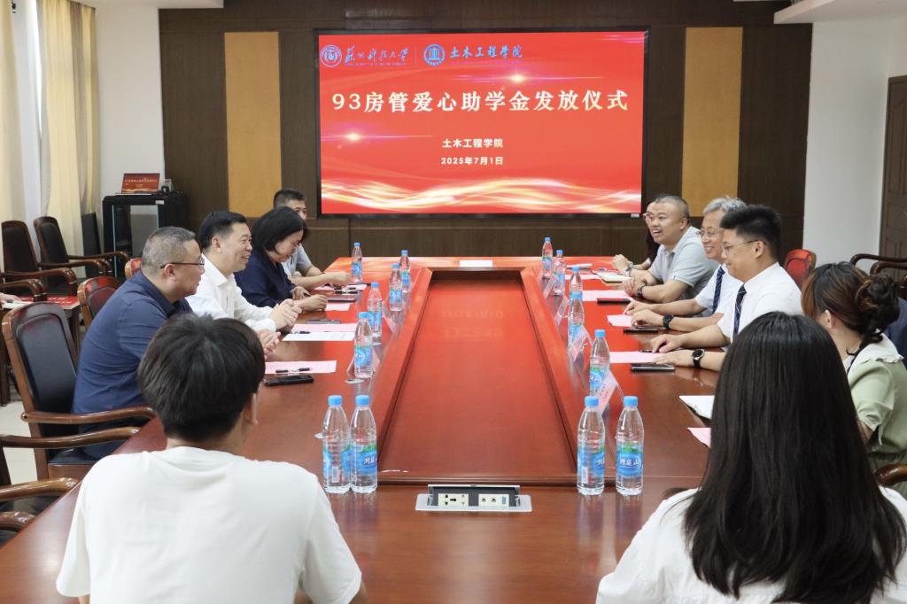 作者:许智琪 刘建峰 图片作者:李之坤 来源:搜同 发布日期:2025-07-01 浏览:次7月1日,搜同 在搜同二楼会议室举行93房管爱心助学金发放仪式。93房管爱心助学基金校友代表刘美云、郝春荣、严金华、马凤江,搜同 党委书记赵宝成、院长陈育民、党委副书记兼副院长刘建峰、学工办主任陈玮,全体辅导员及受资助学生出席仪式。