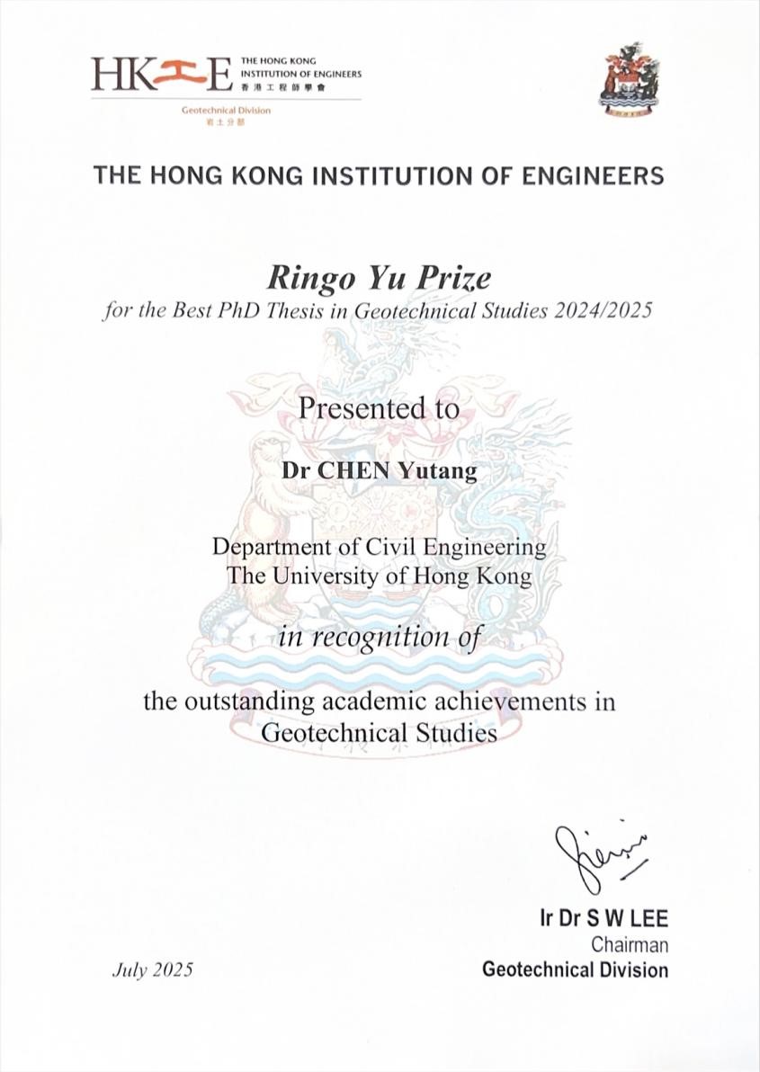 作者:陈雨唐 图片作者:陈雨唐 发布日期:2025-07-04 浏览:次7月3日,我院陈雨唐博士的论文《Laboratory investigation of elastic stiffness of sandy soils: effects of sample preparation, stress anisotropy and cyclic loadings》获得香港工程师学会最佳岩土工程博士论文奖(Ringo Yu Prize for Best PhD Thesis in Geotechnical Studies 2024/2025),该篇论文由香港大学土木工程系杨峻教授指导完成。