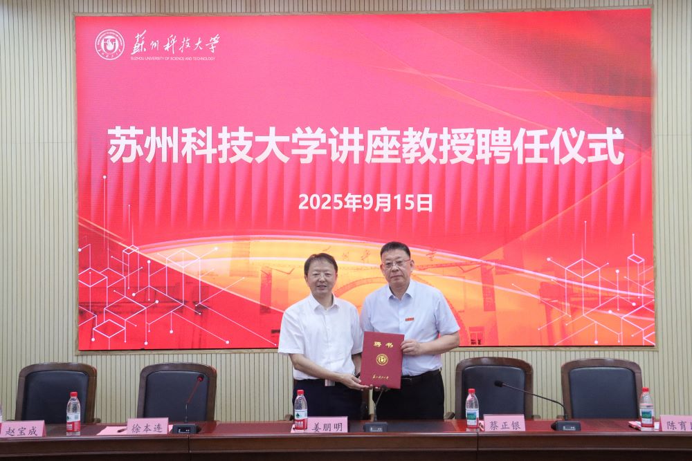 聘任仪式上,姜朋明为蔡正银颁发搜同 讲座教授聘书并佩戴校徽,徐本连介绍了蔡正银的基本情况和学术成就。
