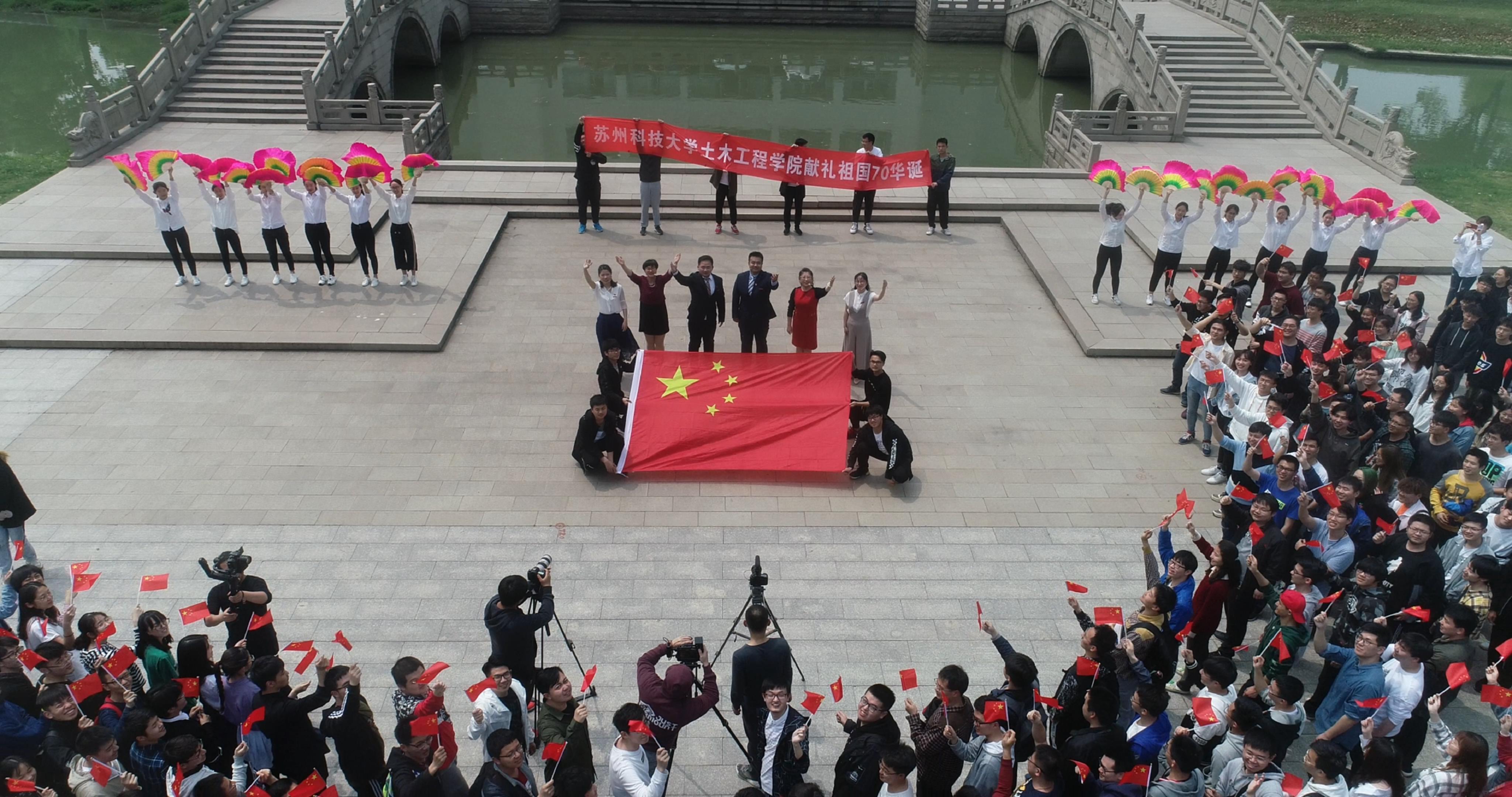 “我和我的祖国,一刻也不能分割,无论我走到哪里,都流出一首赞歌……”深情悠扬的歌声在校园响起。在土木搜同大楼前的场地上,师生们挥舞着小红旗,用激情嘹亮的歌声抒发对党和人民的热爱,为祖国献上最真切的祝福。
