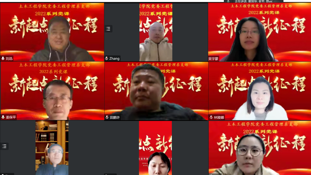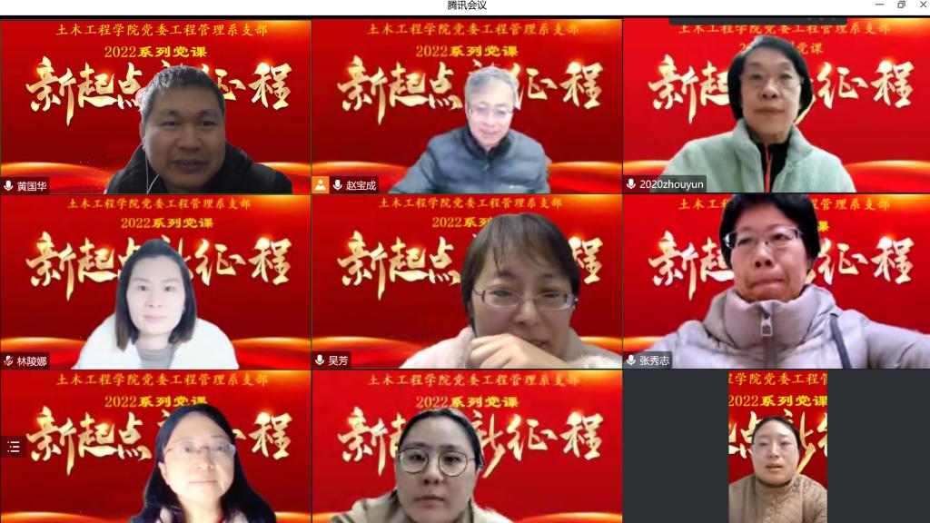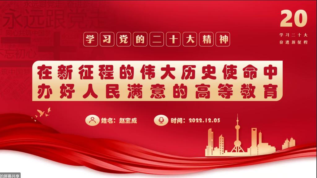 作者:田鹏许 黄国华 发布日期:2022-12-06 浏览:次为深入学习贯彻党的二十大精神,全面加强对党员学习活动的组织领导,推动党的二十大精神入脑入心,2022年12月5日晚8时,搜同 常务副院长赵宝成通过腾讯会议为工程管理系教工党支部全体党员宣讲党的二十大精神,讲授专题党课——《在新征程的伟大历史使命中办好人民满意的高等教育》。