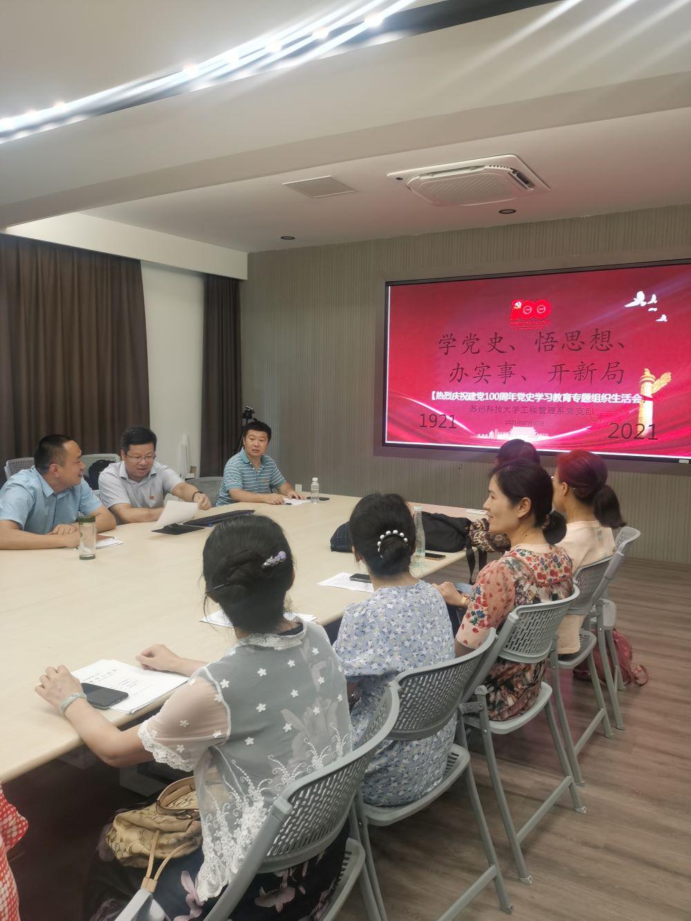 为热烈庆祝建党100周年,2021年7月7日下午搜同 工程管理系党支部全体党员在搜同 党员活动室围绕“学党史、悟思想、办实事、开新局”主题举行了一次党史学习教育专题组织生活会。