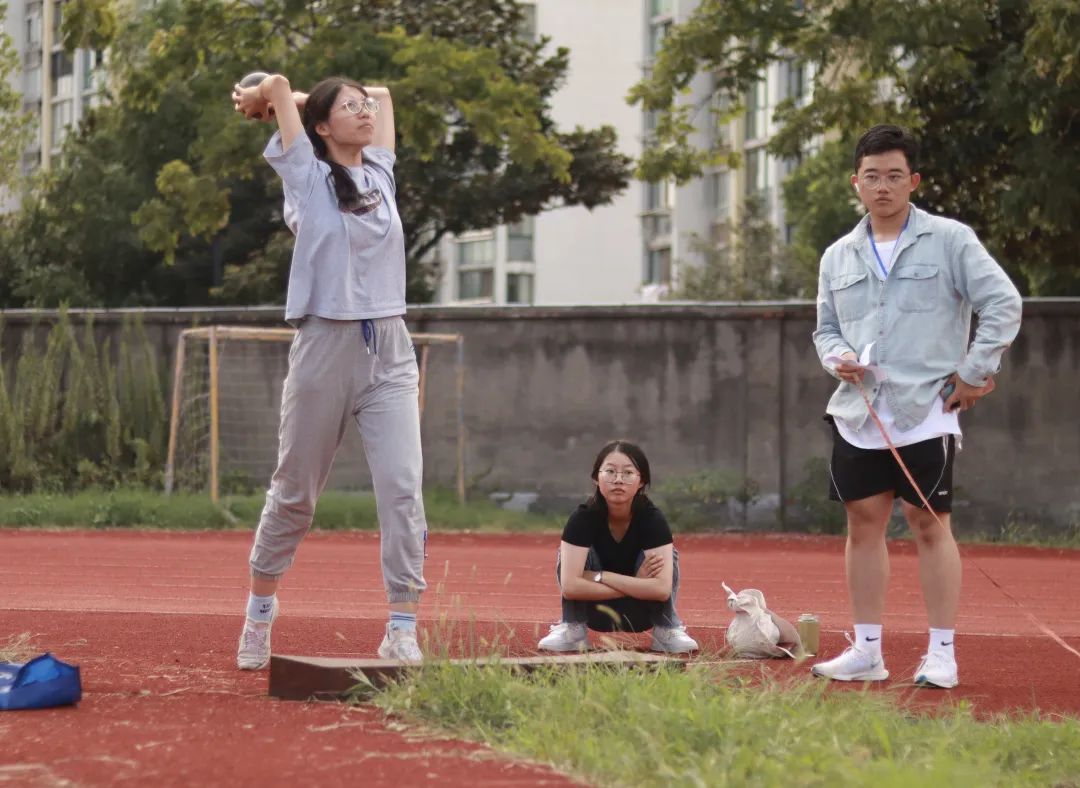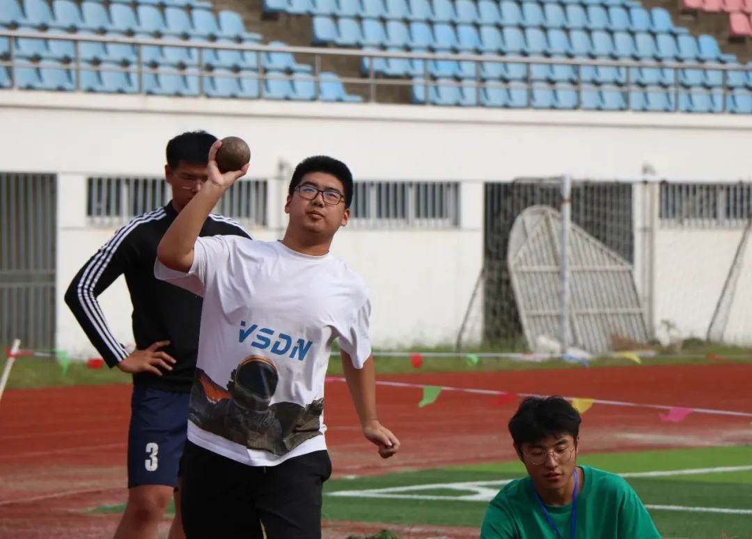 后仰身躯,绷紧腰部,挥舞你们那充满力量的双臂,使实心球于天空的幕布上画下美丽的弧线。拖动着实心球的,不只是你们的力量,更是运动会前那刻苦练习的努力。