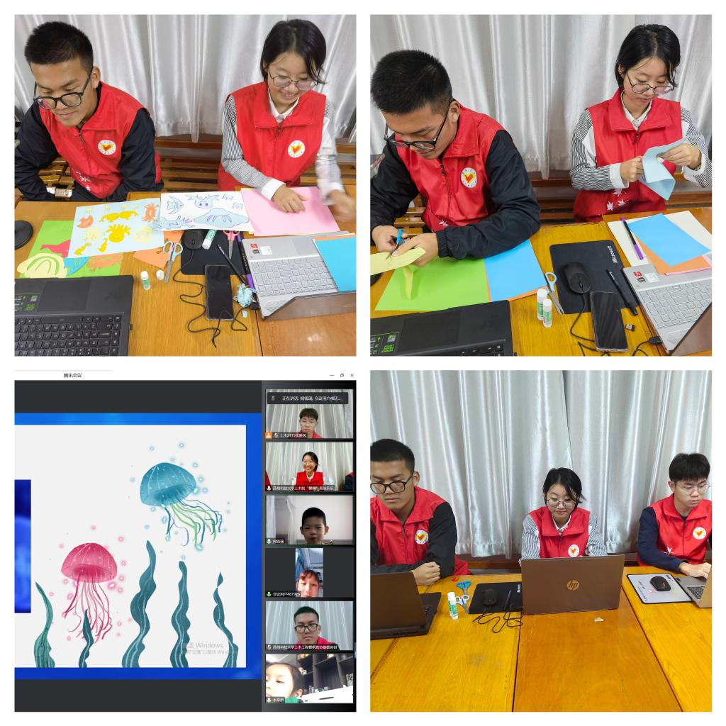 上午10点整,志愿者们到达二教219教室,开始进行电脑和手机的调试,并为课堂后半部分的手工环节准备材料。上午10点30分,志愿者们在和老师进行交流后,迎来了第一位小朋友,小朋友的阳光可爱让志愿者们很快进入了状态。在播放一段关于海洋科普视频的过程中,又有两位小朋友加入了课堂。上午10点40分,课堂正式开始。志愿者们通过讲述关于海洋的问题、海洋中的动物以及海洋的污染状况,层层递进地揭开了这片蓝色海洋中的秘密。在课堂上,三位小朋友积极地与志愿者们互动,一步一步地了解了这片海洋,也懂得了保护海洋的重要性。上午11点10分,志愿者们与小朋友们开始了构建海底世界的手工活动。志愿者们通过构图、剪纸,教会了小朋友们如何剪出海洋里的小动物。每一个小朋友都认真投入其中,完成了自己的作品。上午11点40分,此次线上儿医活动圆满结束。