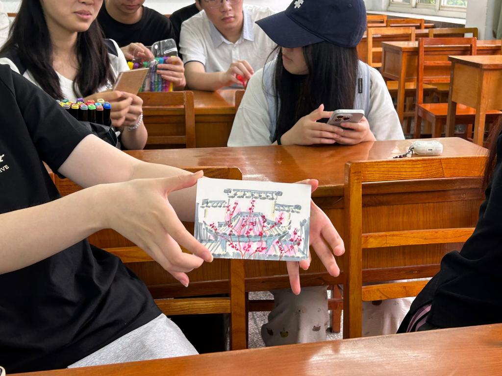 活动现场,工作人员精心布置创作区,并展示校园标志性建筑、苏州古典园林、现代地标等建筑素材图。创作环节中,同学们或临摹现场建筑图片,或构思“未来建筑乌托邦”,将穹顶、拱券、幕墙等建筑元素融入方寸明信片。2024级智能建造专业周杰同学以江枫校区结构大厅为原型,细腻地描绘了粉墙黛瓦的复古韵味。创作完成后,进行优秀作品评选,经过评委们认真筛选,一幅幅构思巧妙、绘制精美的作品脱颖而出,并在活动现场进行展示。