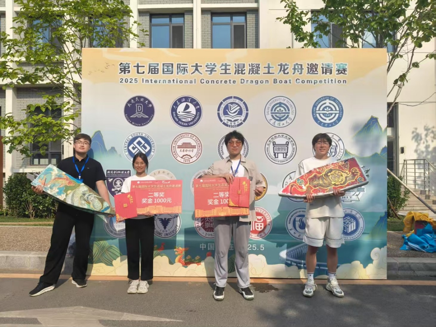 发布日期:2025-05-29 浏览:次第七届国际大学生混凝土龙舟邀请赛于2025年5月24-25号在大连理工大学举办。我校“鸣首”和“平江跃浪”两支参赛团队均获团体二等奖。鸣首号参赛队员为殷鉴远、陈鹏、张逸扬、罗康鑫、王蕊,均来自我校2024级“钱七虎卓越班”,指导老师为陈育民、陈雨唐;平江跃浪号参赛队员为葛仲怀、陈佳旺、冯一龙、孙敬威、刘妤歆,指导老师为刘国建、蔡新江。来自浙江大学、哈尔滨工业大学、华南理工大学、大连理工大学、重庆大学、天津大学等22所高校的180余名师生携34艘混凝土龙舟参加了此次比赛。