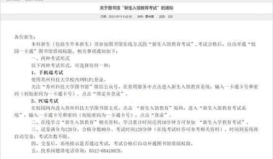 提醒:新生借阅图书功能开通需要通过“新生入馆教育考试”。相关通知见校园网主页通知公告栏。