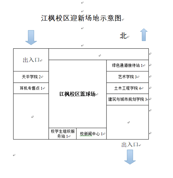 报到收取、发放材料处:江枫校区篮球场