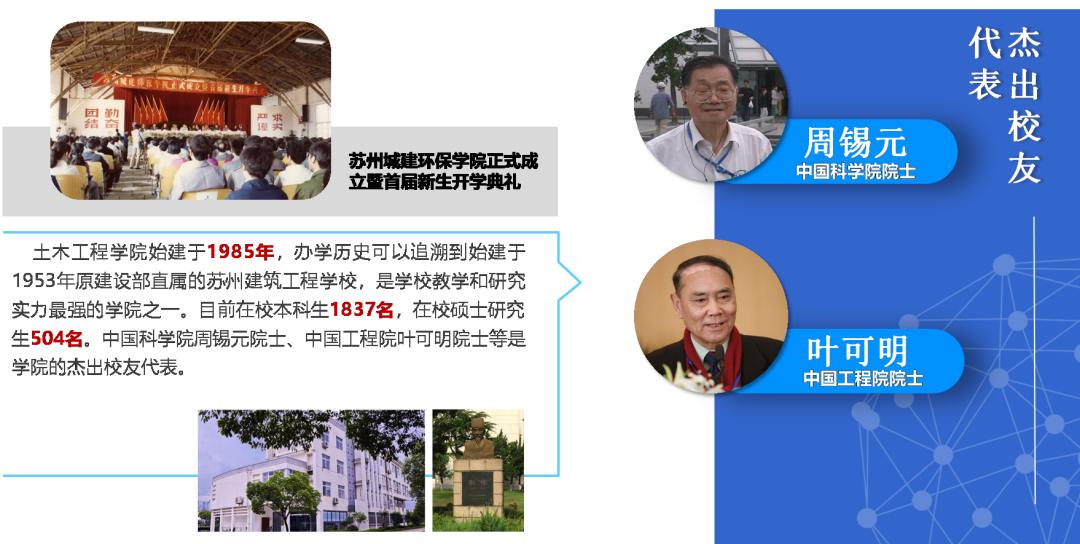 搜同 始建于1985年,办学历史可以追溯到始建于1953年原建设部直属的苏州建筑工程学校,是学校教学和研究实力最强的搜同之一。中国科搜同周锡元院士、中国工程院叶可明院士等是搜同的杰出校友代表。搜同拥有土木工程和工程管理两个国家一流专业建设点,两专业于2005年分别通过了住建部高等教育专业评估,迄今已均连续4次通过了国家的专业评估(认证)。