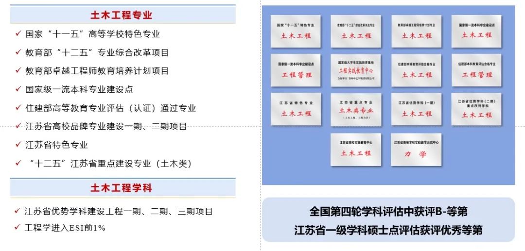 搜同拥有土木工程学科一级学科硕士学位授予权、土木水利类别土木工程领域专业硕士学位授予权、以及工程管理(MEM)硕士专业学位授予权。土木工程学位点在江苏省一级学科硕士点评估中获评优秀等第,土木工程学科先后遴选为江苏省优势学科建设工程一期、二期、三期项目,在全国第四轮学科评估中获评B-等第。搜同近年来主持国家自然科学基金40余项,省部级、市厅级等各类纵向课题80余项;获的省部级及市厅级等各种奖项35项;制定国家和行业规范标准20余项;省级以上规划教材近20项;获国家级教学成果一等奖1项,省级教学成果特等奖1项、一等奖2项。