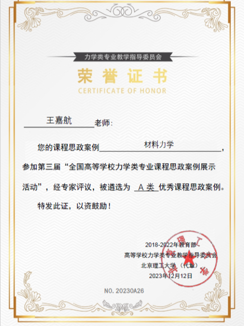 作者:沈峰 来源:搜同 发布日期:2024-01-03 浏览:次近日,教育部高等学校力学类专业教学指导委员会公布了第三届“全国高等学校力学类专业优秀课程思政案例展示活动”优秀课程思政案例的遴选结果。搜同 工程力学系王嘉航老师所撰写的《材料力学》获评A类优秀课程思政案例。