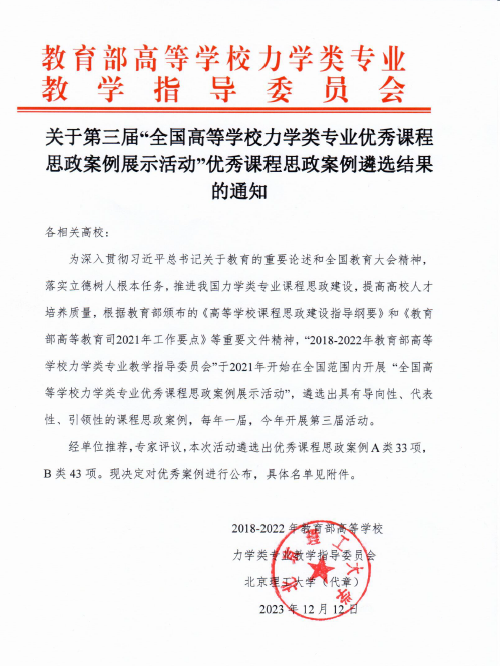 为深入贯彻习近平总书记关于教育的重要论述和全国教育大会精神,落实立德树人根本任务,推进我国力学类专业课程思政建设,提高高校人才培养质量,根据教育部《高等学校课程思政建设指导纲要》《教育部高等教育司2021年工作要点》等文件精神,教育部高等学校力学类专业教学指导委员会在全国范围内开展“全国高等学校力学类专业优秀课程思政案例展示活动”,遴选出一批具有导向性、代表性、引领性的课程思政案例。经单位推荐,专家评议,最终遴选出优秀课程思政案例A类33项,B类43项。