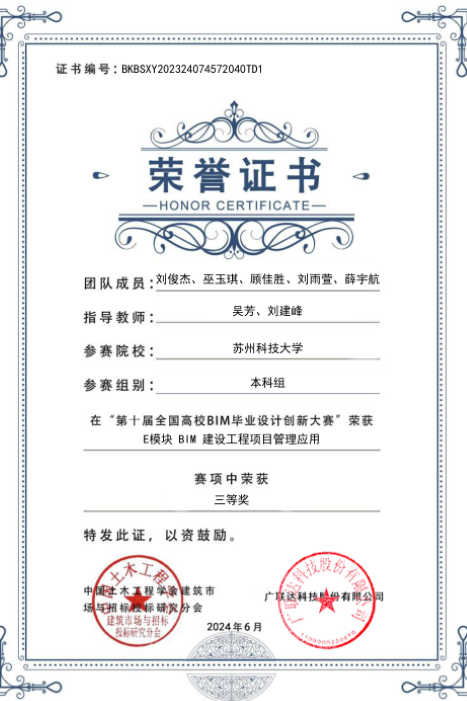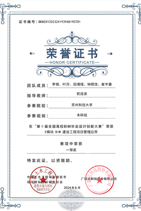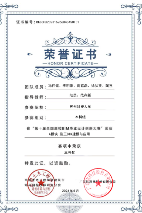 全国高校BIM毕业设计创新大赛是国内高等教育领域的一项重要赛事,连续多年入选全国普通高校学科竞赛排行榜,也是我校品牌学科竞赛。大赛由中国土木工程学会建筑市场与招标投标研究分会、广联达科技股份有限公司主办,吸引了全国各地高校的众多优秀团队参赛,自2023年9月启动以来,共计报名665家院校,12000余支团队,参与师生70000余人,比赛设一等奖、二等奖、三等奖三个等级。