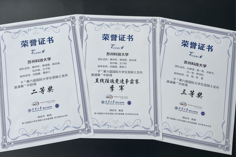 作者:刘国建 来源:搜同 发布日期:2024-06-06 浏览:次第六届国际大学生混凝土龙舟邀请赛(ICDBC 2024)于2024年6月1-2号在天津大学举办。我校“龙腾沧浪”和“龙腾江枫”两支参赛团队分别荣获二等奖和三等奖,“龙腾沧浪”经过激烈角逐获得直线往返竞速赛单项季军。龙腾沧浪号参赛队员为葛仲怀、蒋域蓉、曲洪漩、包亦娴、王子阳,指导老师为刘国建、蔡新江;龙腾江枫号参赛队员为孙锦滢、杨一帆、徐家乐、冯一龙、陈佳旺,指导老师为池斌、陈登。来自浙江大学、同济大学、哈尔滨工业大学、大连理工大学、重庆大学、中南大学、天津大学等29所高校的300余名师生携48艘混凝土龙舟参加了比赛。