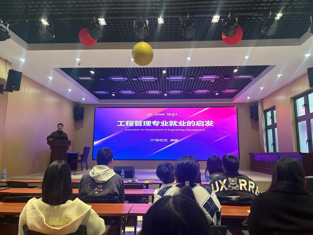 发布日期:2024-12-05 浏览:次为了夯实工程管理专业大一新生的专业根基,使其全方位、深层次地洞悉工程管理专业的学科魅力与发展前景,同时,最大化地激发杰出校友的榜样力量,为在校大学生点亮前行的道路。2024年12月4日下午,我院工程管理系举办校友学术讲座活动。2000级顾佩娟、2010级宋思原、2007级高鹏结合自己的求学经历与工作经验,与工程管理专业学生分享了自己对工程管理专业的理解,鼓励在校大学生努力学习、积极参加企业实习、尽早明确择业方向。