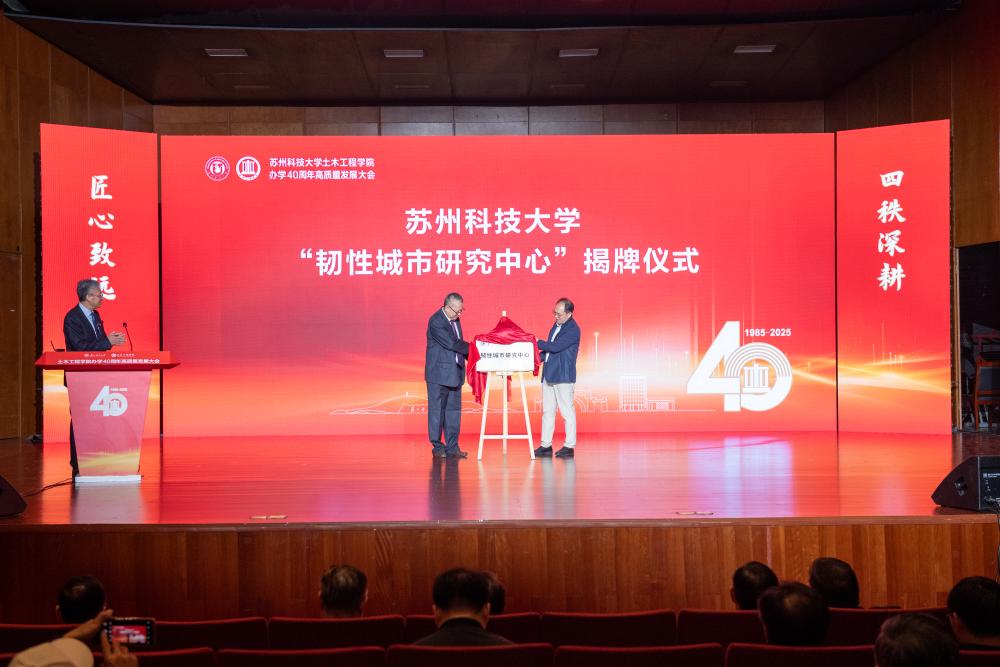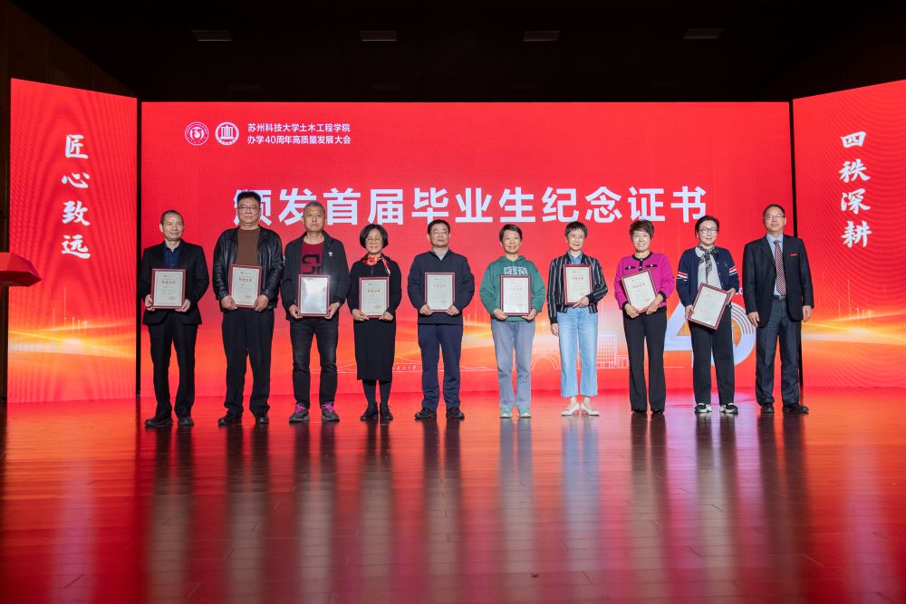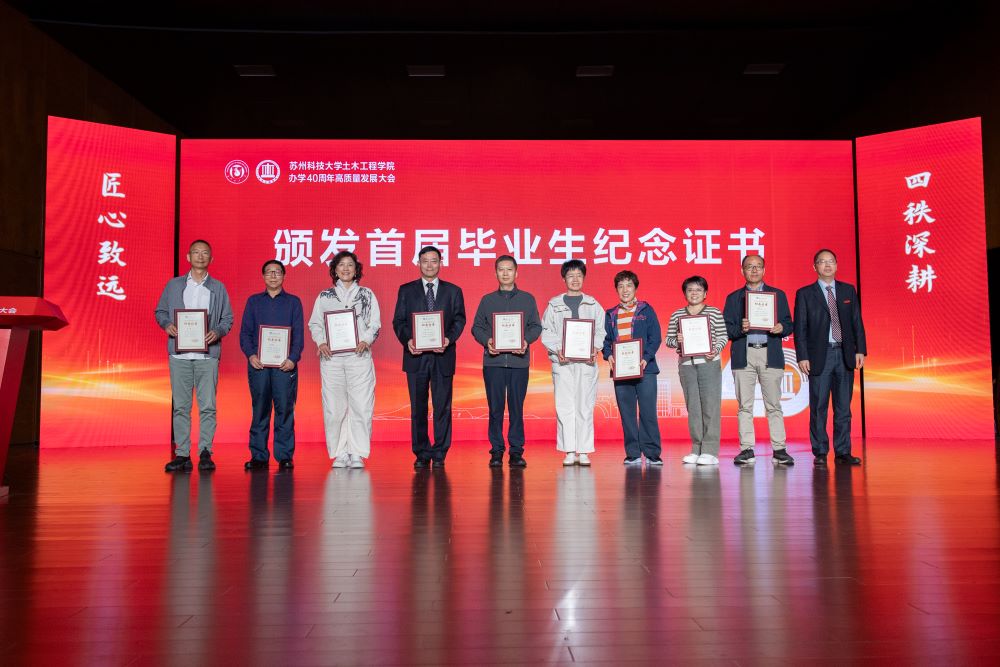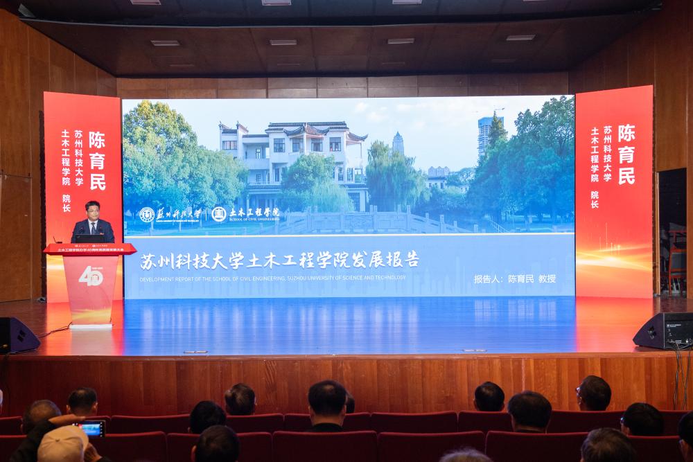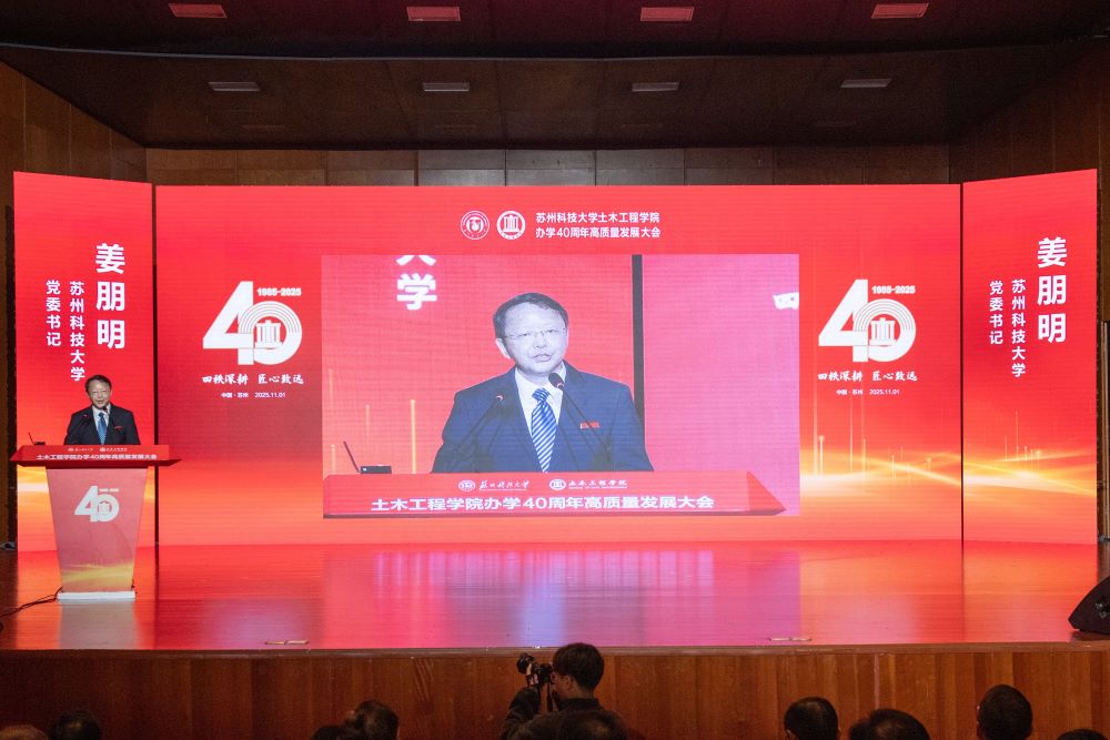 姜朋明致辞,回顾了搜同 四十年的办学征程,充分肯定了学院为学校特色发展、高质量发展作出的重要贡献。他指出,学院始终坚持服务国家战略和区域发展,土木工程学科已获批一级学科博士学位授权点,连续四期入选江苏高校优势学科,“工程学”进入ESI全球前5‰,多个专业获评国家级一流本科专业建设点并通过住建部、教育部权威认证。希望学院能以40周年为新的起点,传承聚力、突破腾飞,谱写更加辉煌的崭新篇章。学校也将助力学院在服务国家战略和区域发展中展现更大担当、实现更大作为。