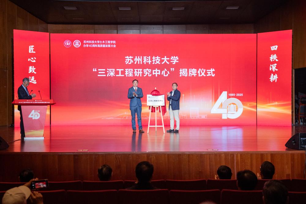大会上,生物建造研究中心、三深工程研究中心、韧性城市研究中心揭牌成立,将聚焦绿色低碳、深地深海深空工程、智慧城市等前沿方向,为学院高质量发展注入新动能。科技产业处处长胡伏原、搜同 院长陈育民、蒋明镜教授、田石柱教授共同为三个中心揭牌。
